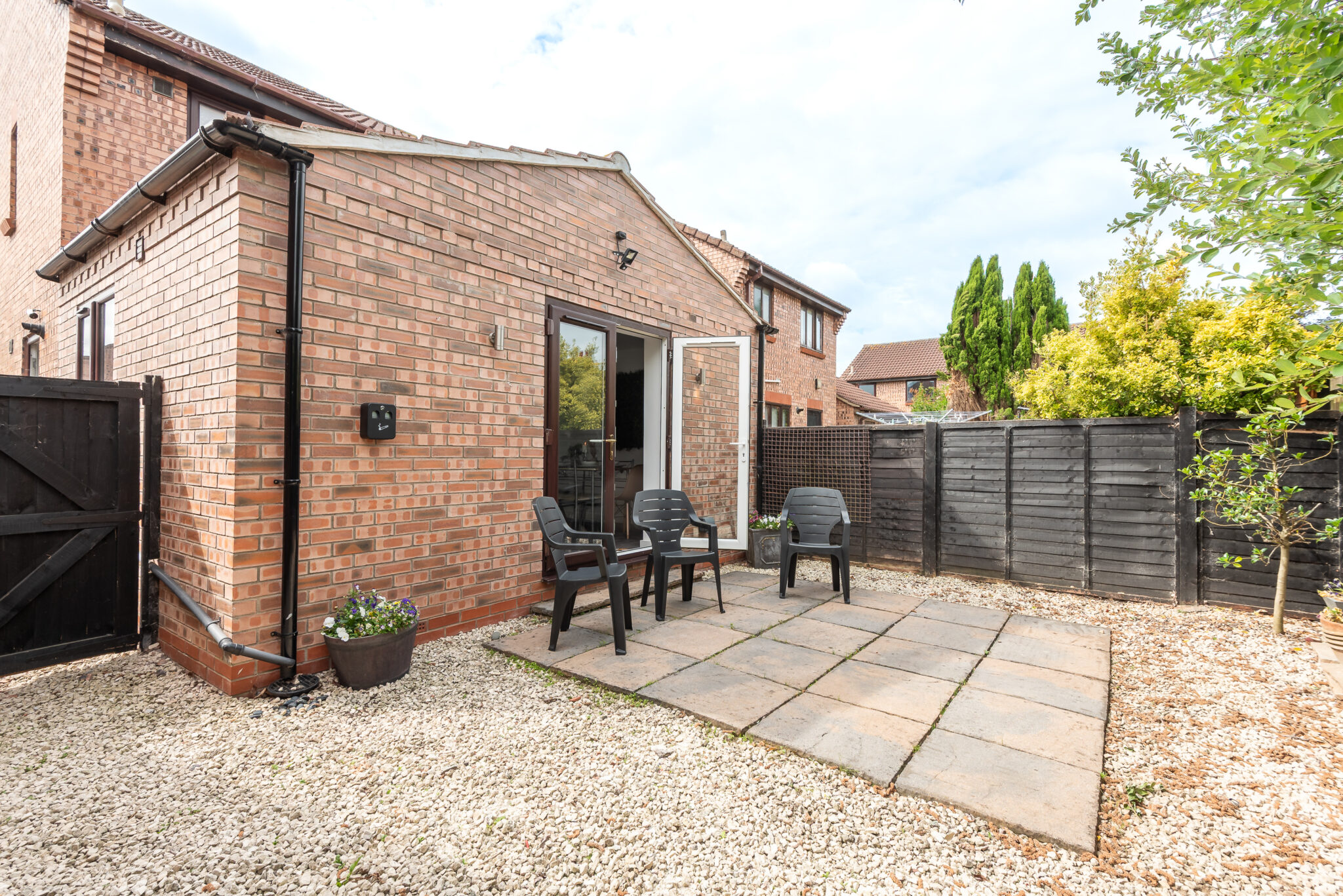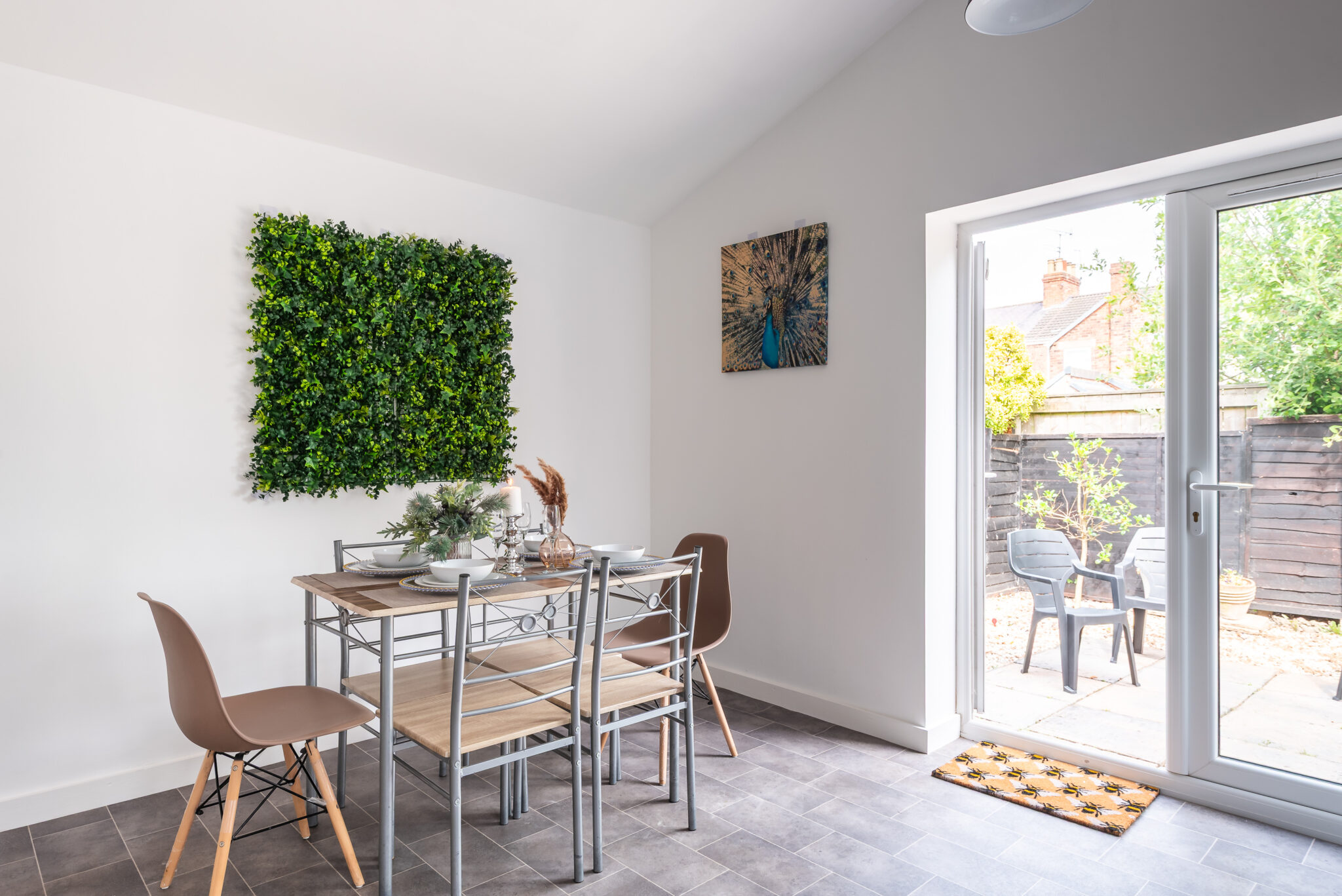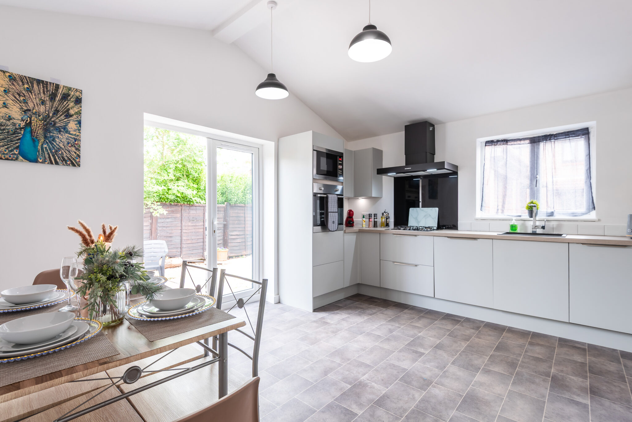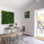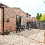 The fully equipped kitchen provide ample space for relaxation and entertainment which features a fridge, oven, hob, kettle, microwave, dishwasher and toaster, along with ample cupboard space and all necessary cookware and crockery. Each booking includes a small welcome pack with tea, coffee, sugar, and milk. The dining table and chairs comfortably seat four, with space for up to six. The door in the dining area open to a lovely garden.